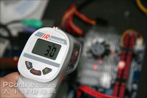 在系统待机状态下,北桥/CPU散热器鳍片温度仅仅为30摄氏度,温度可以说非常低。