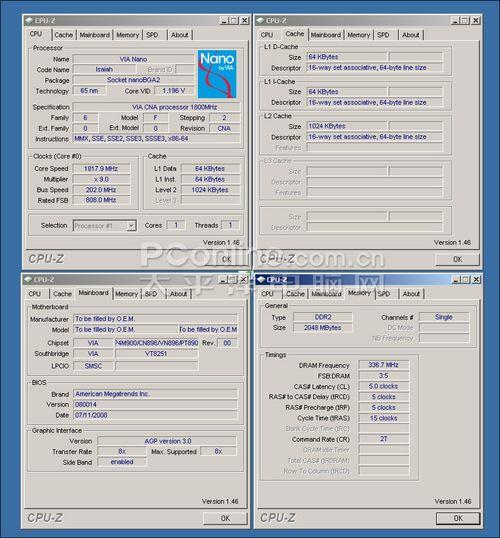 从CPU-Z截图来看,VIA Nano L2100处理器架构名称为“Isaiah”,基于65nm工艺制程,默认电压不足1.20V,支持MMX、SSE、SSE2、SSE3、SSSE3、X86-64指令集。默认外频达到200Mhz,倍频为9,L1缓存为64K,L2缓存达到了1M。主板在插了两条内存的情况下仍只能以单通道下运行。