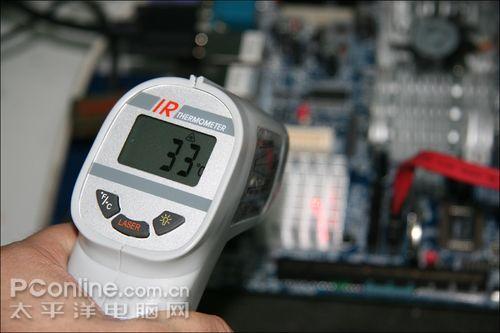 在系统空闲情况下,南桥散热鳍片温度为33摄氏度。(这或许也是不少采用8251南桥的主板没有给它配备散热鳍片的原因吧)