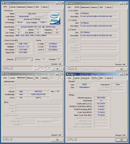 Intel ATOM Z530处理器架构名称为“Diamnondville”,基于45nm工艺制程,默认电压不足1.10V,支持MMX、SSE、SSE2、SSE3、SSSE3、EM64T指令集。默认外频为133Mhz,倍频最高为12,L1缓存为56K,L2缓存达到了512K。内存方面,主板支持双通道规格,但频率仅为266Mhz,也就是DDR2 533。