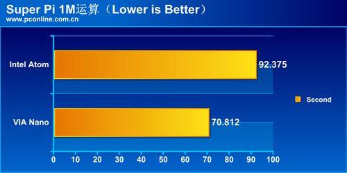 在我们非常熟悉的Super Pi 104万位评测中,VIA Nano大幅度领先于Atom处理器,但两者和当前主流的双核处理器相比仍要落后许多。从Super Pi评测成绩来看,VIA Nano处理器Super Pi成绩大致和早年的AMD Athlon 2000+相当,而Atom则大致和赛扬4 1.7G处理器相当。
