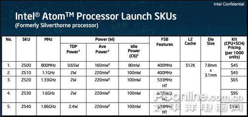 Atom处理器一共有五个型号,分别是:Z500(800MHz)、Z510(1.1GHz)、Z520(1.33GHz)、Z530(1.6GHz)、Z540(1.86GHz)。其中除了Z500和Z510前端总线为400MHz外,其余均为533MHz。