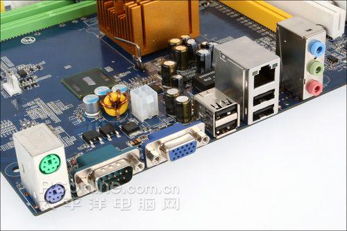 主板电源接口采用老式的20pin接口,且不需要4pin +12V供电。从主板布局可以看到,CPU直接从20pin主接口取电,主板采用了两相滤波电路,每相电路采用一上一下共两个Mosfet,前后级滤波电容仅三颗。