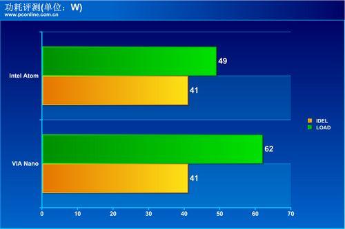 在功耗评测中,两者在空载的的功率一致,均为41W,和一盏白炽灯或者风扇大致相当。在满负荷的情况下,VIA Nano平台功耗上升到了62W,而Atom平台则仅为49W,后者显然有明显的优势。如果用户还要接上光驱、USB设备等配件,整机功耗依然可以控制在100W一下,因此用户购买小型电源足以满足平台功耗要求。