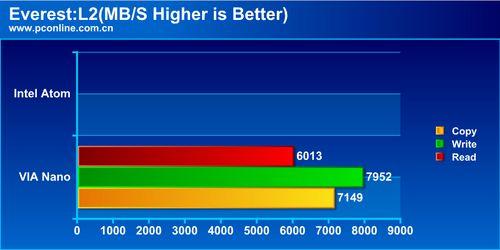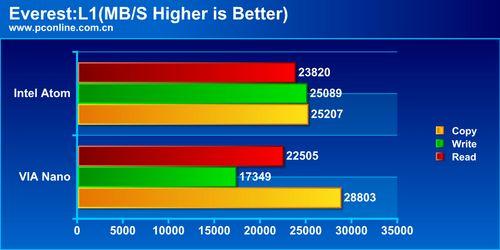 在CPU L1缓存读写评测中,Atom处理器显然更平衡些,而Nano处理器则在Copy项目中有较大优势。