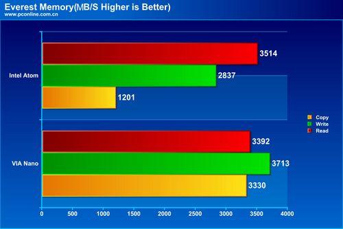 在考察内存带宽的评测项目中,不支持双通道的VIA Nano平台反而取得了明显的领先优势,特别在Copy项中大幅度领先于Atom平台。