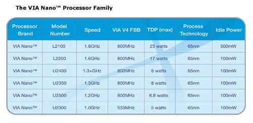 VIA nano处理器一共有六款处理器,型号从低频到高频分别为U2300、U2500、U2350、U2400、L2200和L2100。它们均采用65nm工艺制程,但在频率和功耗上存在较大差异。最低频的U2300是唯一一款外频为133Mhz的VIA nano处理器,TDP(热设计功耗)也最低,仅为5W。其余几款VIA nano处理器均具备了200Mhz外频,主频从1.2G至1.8G不等,其中L2100的热设计功耗最高,达到了25W,但相比于AMD羿龙四核处理器最高的140W TDP功耗也算是小巫见大巫。(TDP的英文全称是“Thermal Design Power”,中文为“热设计功耗”,是反应一颗处理器(CPU或GPU)热量释放的指标,它的含义是当处理器达到负荷最大的时候,释放出的热量,单位为瓦(W)。)