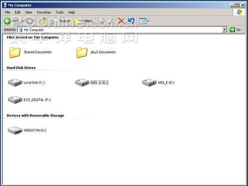 当我们把CF卡插入主板并进入系统后,CF卡便能像普通硬盘盘符那样正常使用了,如图“盘符F”所示,此时它的图标已经变成了本地硬盘特有的图标,下面的移动盘符有明显的区别。但需要说明的是,此时的CF卡发热量比使用读卡器时读取要高许多。