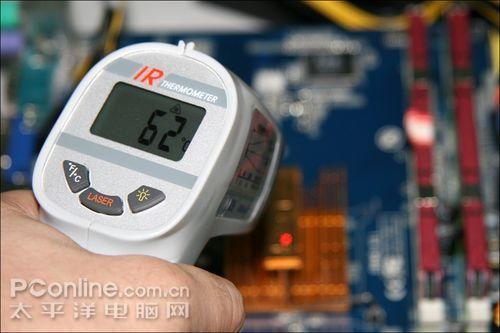 945GC北桥散热鳍片的温度则要比CPU高许多,达到了62摄氏度。