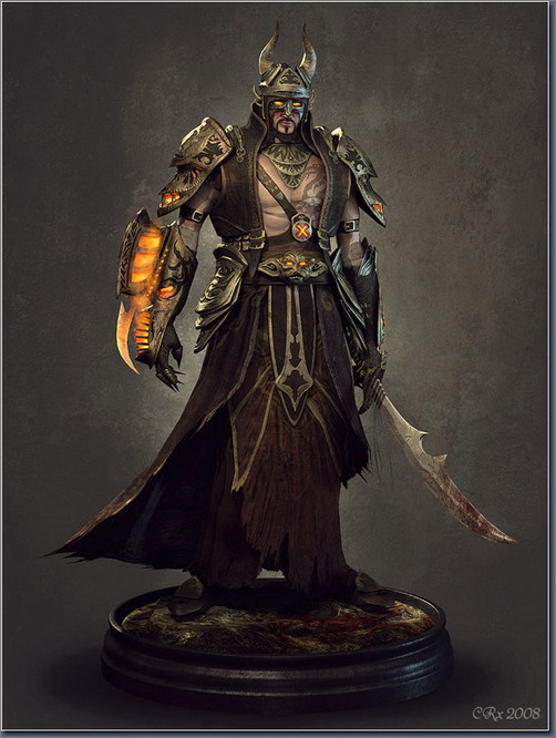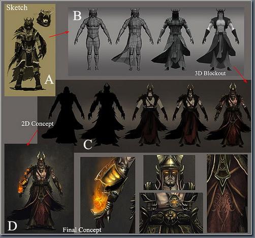 为了这一概念,我用Photoshop绘了幅草图(图01)(A);我想塑造一个没有明确风格的战士,所以最后决定创作一个兼具海盗与武士风格的战士形象。
