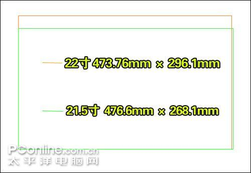 从上图可以看出,在屏幕的面积大小上,22寸明显要大出21.5寸不少,面板的切割成本的确经济了一些。