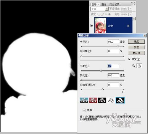 对于调整边缘工具,想必有很多朋友都比较陌生。我们有必要在用它进行去白边前对它有个简单的认识。以抠出主角女孩为例,我们先使用套索工具建立出主角女孩的选区,单击属性栏中的“调整边缘”按钮,弹出调整对话框。现在我们来看一下它的界面(图2),可以看到,调整边缘工具分为左上角的调整滑块区、中间的显示模式区、下部的说明区、右上角的按钮与预览区四个大的区域。