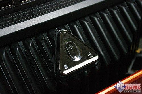 轻推G7700的前盖,其内部面板终于显示在我们面前,黑色的面板配合竖直的条状纹路设计,强悍、霸道值气喷薄而出。机箱顶部的三角形是主机电源按键,按下后会有幽蓝色灯光放出,煞是好看。同时三角形的两个底角还肩负着硬盘指示灯和网络指示灯的功能,面对这样精巧的设计,我们只得将赞叹毫无保留的奉上。