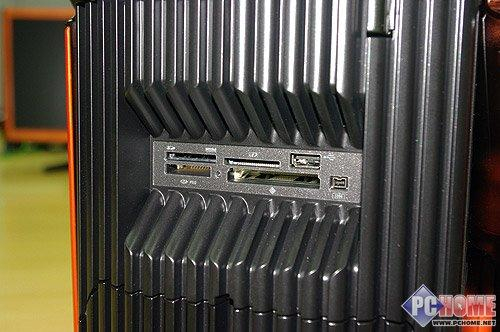 机箱中部是G7700的读卡器,提供了兼容市面绝大多数主流存储卡的数据读写功能。同时还提供了一个额外的USB2.0接口以及Mini IEEE 1394接口。这样G7700的前面板就总计提供了5个USB接口、1个IEEE 1394接口以及读卡器和音频插孔,绝对堪称目前台式PC的接口之王了。