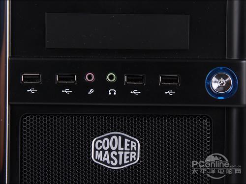 酷冷至尊 仲裁者II机箱的前置接口设计在前面板中部,一共提供了4组USB2.0接口和1组HD Audio音频接口,由于没有采用隐藏式设计,所在前置接口在使用一段时间后会出现灰尘堆积的情况。在接口右边被蓝色透明指示灯所包裹着的银色按钮是电源开关,该机箱同样没有重启键设计。
