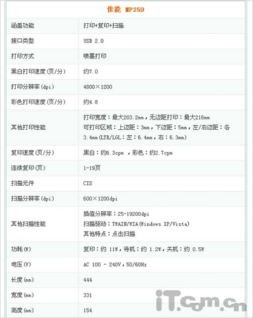 评测总结:佳能MP259喷墨一体机主要面向SOHO办公、家庭用户以及学生推出,体积小巧、功能强大,结合简洁易用的控制面板,操作更易上手。佳能MP259采用佳能尖端的FINE打印头技术,高密度多喷嘴的打印头可以实现高速度高品质打印。另外,佳能MP259喷墨一体机还附带多款实用型很强的软件,为用户的使用带来极大方便。