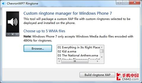 说明:Windows Phone 7自定义铃声工具ChevronWP7 Ringtone(点击下载)最多识别将5个WMA声音文件打包到1个XAP包里,用户使用时需要遇到添加无反应时需要注意一下。