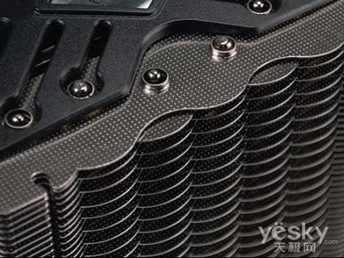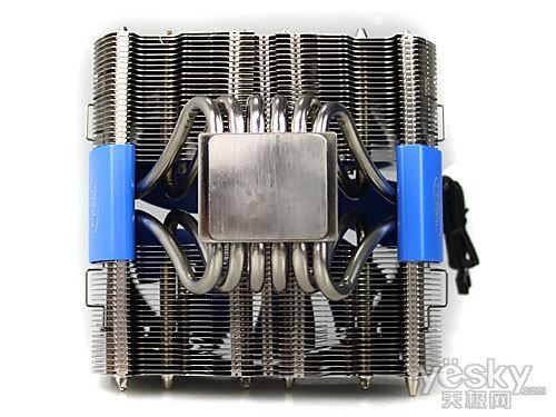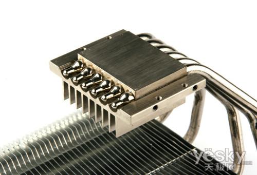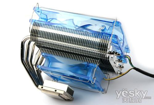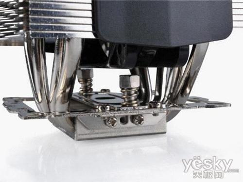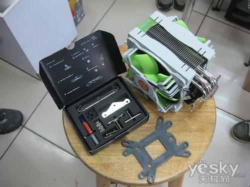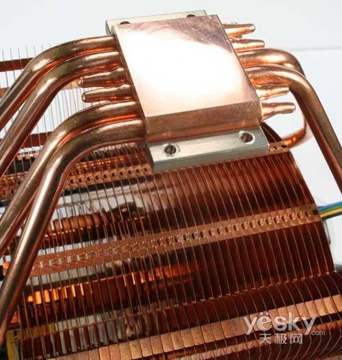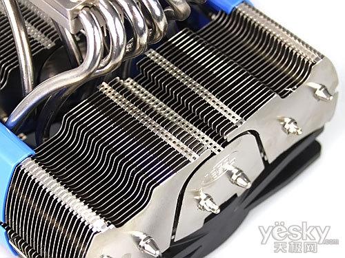 散热块部分由5根6mm热管和41片铝制散热鳍片构成,鳍片厚度为0.5mm.散热器正背面都安装了120mm风扇,加强散热效果。5根热管通过焊接工艺贯穿于底座与散热鳍片之间,表面经过镀镍加工处理,可增加抗氧化能力;底座经过盘铣处理,非常平滑。另外配件方面也相当齐全,配备Intel LGA 775/1156/1366和AMD平台扣具。