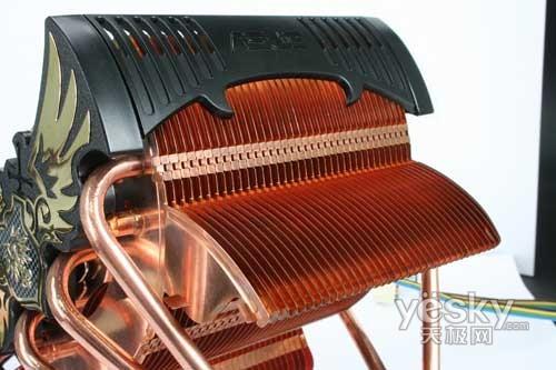 华硕皇家骑士散热器底部经过了镜面处理,相当平整、光滑,可以充分的和CPU表面接触,最大可能的吸收废热。纯铜热管可以说是目前高端散热器所必备的,而热管数量的多少,从某种意义上也左右着散热效果的好坏,这款散热器提供了六根热管,一侧为四根,而另一侧为两根,六根热管的跨度也很大,贯穿于密集的散热鳍片之间,是散热性能极大增强。