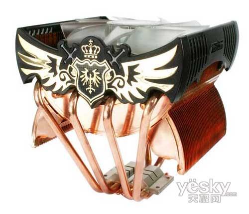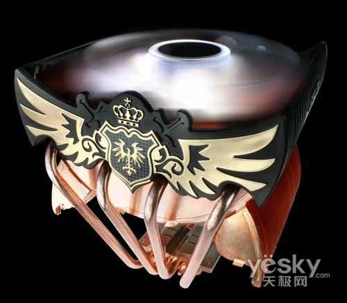 光看名字,就知道这款散热器出身高贵,而在散热器的固定支架两侧,设计有非常漂亮的皇冠以及飞鹰图案。尊贵的皇冠加上勇猛的飞鹰,打造出华硕皇家骑士的出类拔萃。材质上它继沉默武者Ⅱ之后也采用纯铜的设计,无论是散热鳍片、热管、底座全部纯铜打造,自然是散热性能极佳。
