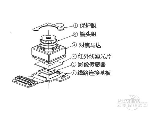如下图,是手机摄像头模组的部件构成图。对应标号从上到下分别为:保护膜(Protect film)、镜头组(Lens System)、对焦马达(Actuator)、红外线滤光片(IR Filter)、影像传感器(Image Sensor)、线路连接基板(FPCBA)