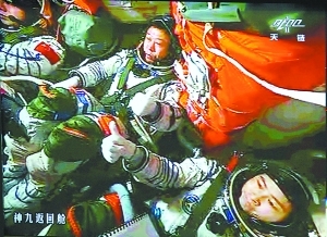 大屏幕上,刘旺一左一右拉起刘洋和景海鹏的手,激动地握了又握,随后三人一起面向摄像机挥手,坐在中间的刘旺用力握拳,刘洋露出甜美的微笑。按照计划,3名航天员将再次进驻天宫一号,继续开展相关科学实验。