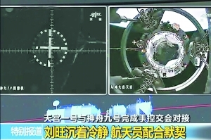 “各号注意,我是北京,根据北京遥测数据,天宫一号航天员乘组状态良好,手控对接正常完成。”