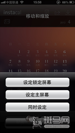全部设定好,点击右上角的保存键,你的锁屏壁纸就会加入到相册。由于iOS系统的限制,我们还需要再进一步的操作才能把它添加到锁屏界面上。 进入设置界面,选择“亮度与壁纸”,再点击墙纸,之后在相应的相册中选择设计好的壁纸就可以了。以后只要点亮锁屏界面就能轻松的看到本月的日历了,更可以 选择自己心仪的照片炫给朋友看。