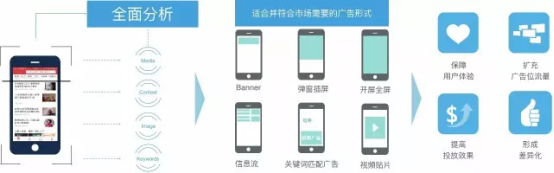通过与媒体进行前期沟通了解其需求,并基于用户浏览习惯、平台环境及内容、展示场景等,为媒体充分挖掘合适的广告展现位置,并量身定制广告形式(横幅、全/插屏、开屏、信息流、视频等),且通过自适应功能,能自动调整广告素材、尺寸以适应不同的移动屏幕的大小。充分保障用户体验、营销者展示需求的同时,最大化提升平台广告效果与收益。
