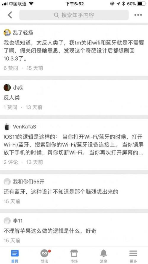 知乎上关于 iOS 11 控制中心无法真正关闭 WiFi、蓝牙的反馈