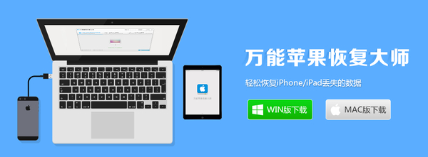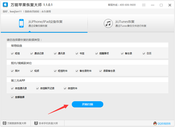 2.我们运行万能苹果恢复大师,并将需要导出微信记录的苹果手机连到电脑上。这里选择“从iPhone/iPad设备恢复”选项,点击“开始扫描”按钮。