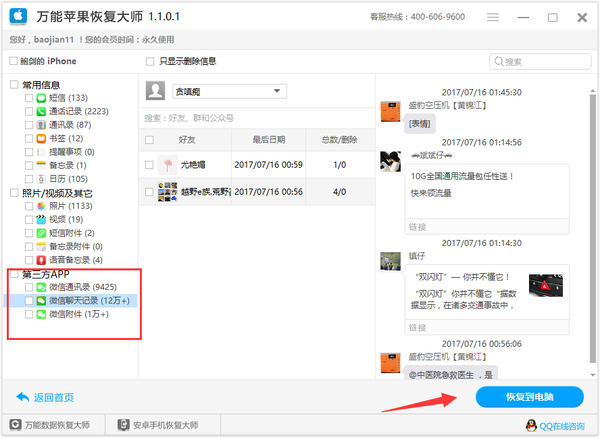 4.可以在软件右侧预览需要导出的数据,找到需要导出的数据,点击恢复到电脑,就可以导出完成了!