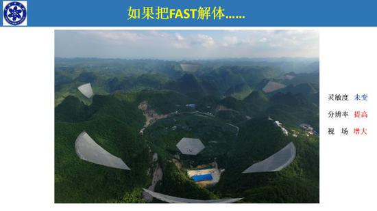 我们试想下,如果把FAST分解会发生什么事儿?你会发现,它的灵敏度没有变,因为面板一样大;分辨率提高,因为距离拉开了;同时视场变大,因为视场是每一个单块决定,于是把望远镜分解反而更好。