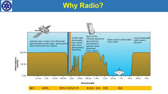 天文望远镜为什么要选择射电波段作为工作波段呢?从下图可以看出,在无线电波段的整个波谱中,射电波段的大气不透明度为零,也就是说所有波段里面只有射电波段在地面上可以直接进行天文观测,不需要到山上,也不需要到太空去。全球无线电波段是唯一可以实现洲际联网观测的,这样的话,全球的射电望远镜可以连成一个网,只要没有干扰就可以工作。