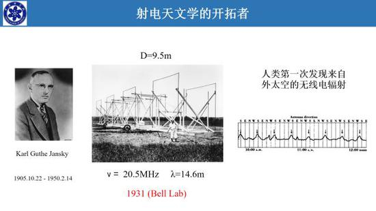 射电天文学的研究始于1931年,当时人们建了一个轮子,轮子上面放一个9.5米直径、可以转动的天线,使人类第一次看到了来自太空的无线电辐射。