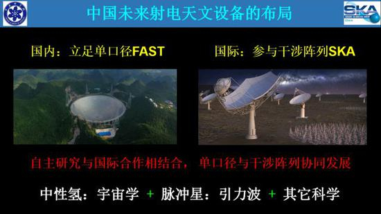 过去五年中国科学院学部给了我们两个任务:让我们制定出未来中国射电天文学发展的设备,其中两项与射电天文有关。大家一致认为:在国内立足单口径射电望远镜FAST,在国际上参加干涉阵列望远镜SKA,自主研究和国际合作相结合,实现单口径和干涉阵列的协同发展。