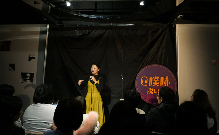 沈清在“噗哧脱口秀”现场演出,与台下一百余位观众共享语言的乐趣。(摄影:郭思瑶)