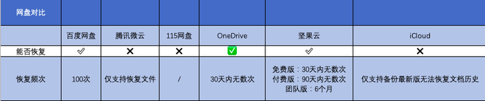 从上面图表就可以看出,所有网盘都提供文件的备份恢复,但是更加高级的单文件历史版本回溯就只有百度网盘、坚果云和OneDrive支持了。其中坚果云以超长时间的保存,让人刮目相看。