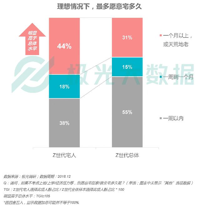 根据极光大数据的调研结果,理想情况下,超过4成宅人愿意宅在家中超过一个月。