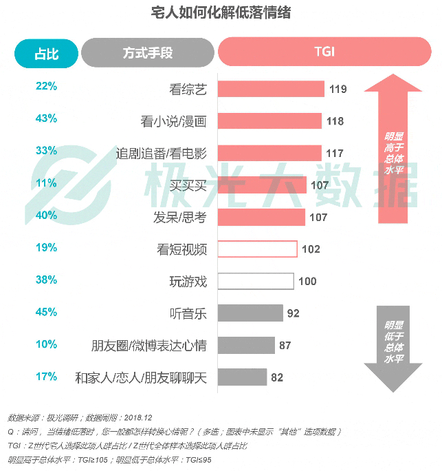 兴趣是宅人最好的情绪调节品。根据极光大数据的调研结果,情绪低落时,宅人们更愿意做自己感兴趣的事来排解,“找他人倾诉/聊天”的需求明显低于总体人群。