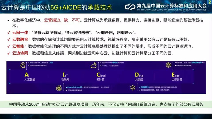从技术方面来看,云计算是中国移动5G+AICDE的承载技术。钱岭指出,“在数字化经济中,云管端边,缺一不可。云计算成为承载数据、提供算力、连接边缘、赋能终端的基础承载技术。”