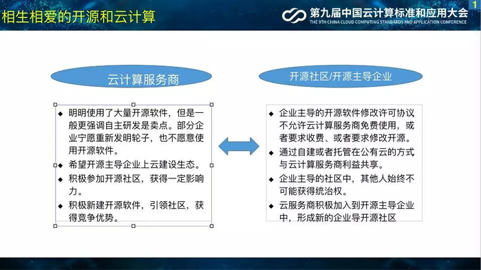 开源社区/开源主导企业方面,企业主导的开源软件修改许可协议,不允许云计算服务商免费使用,或者要求收费、或者要求修改开源。通过自建或者托管在公有云的方式,与云计算服务商利益共享。企业主导的社区中,其他人始终不可能获得统治权。云服务商积极加入到开源主导企业中,形成新的企业导开源社区。