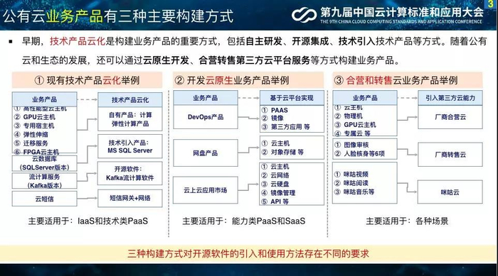 “云化主要适用于IaaS和技术类PaaS;云原生主要适用于能力类PaaS和SaaS;合营和转售主要适用于各种场景。”钱岭指出,三种构建方式对开源软件的引入和使用方法存在不同的要求。