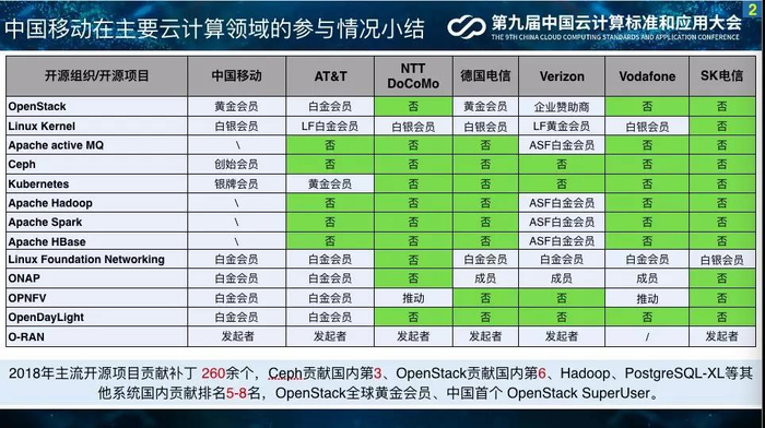 在介绍中国移动在主要云计算领域的参与情况时,钱岭总结道,“2018年主流开源项目贡献补丁 260余个,Ceph贡献国内第3、OpenStack贡献国内第6、Hadoop、PostgreSQL-XL等其他系统国内贡献排名5-8名,OpenStack全球黄金会员、中国首个OpenStack SuperUser。”
