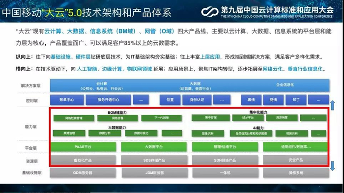 在谈到中国移动“大云”5.0技术架构和产品体系时,钱岭指出,“大云”现有云计算、大数据、信息系统(BM域)、网管(O域)四大产品线,主要以云计算、大数据、信息系统的平台层和能力层为核心,产品覆盖面广、可以满足客户85%以上的云数需求。