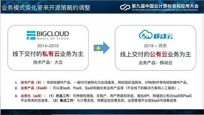 钱岭指出,2014~2019年中国移动云计算以线下交付的私有云业务为主的“大云”交付业务为主,2019年我们的业务转变成以线上交付的公有云业务为主的“移动云”,业务模式变化带来开源策略的调整。