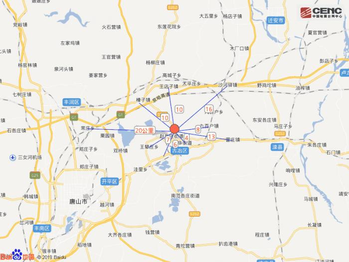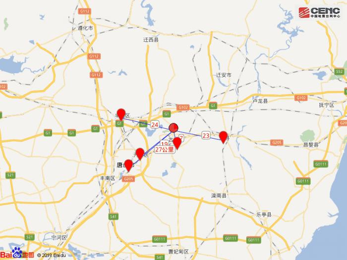 周边县城:震中距古冶区7公里、距开平区19公里、距滦州市23公里、距丰润区24公里、距路北区27公里,距唐山市28公里,距天津市132公里。