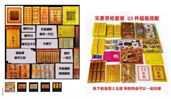 这样一套畅销冥币的完整套餐包含23个配件,覆盖各个币种,从大美圆,到金元宝,天堂地府,汇兑无忧,单位不是亿就是万亿,豪气十足,设计大方,色彩鲜艳,抢手得很。