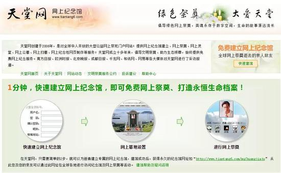 这个天堂网,早在2006年就创建了,专门针对全球华人,并且提供网上纪念馆建立、网上祭奠、网上灵堂、网上公墓、网上扫墓、网上纪念性网页制作等服务,真可以说互联网+殡葬服务一应俱全。