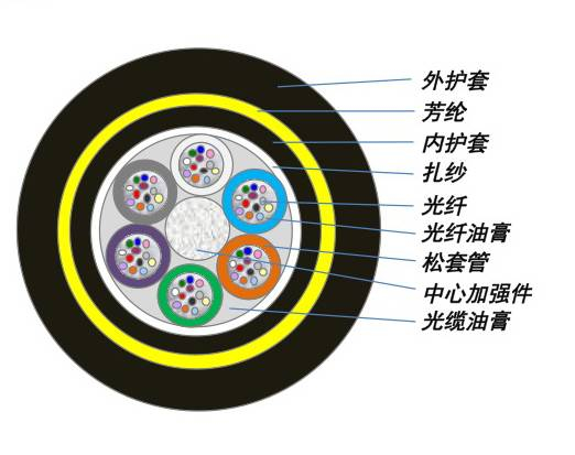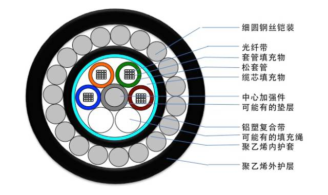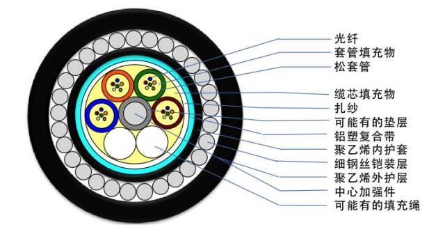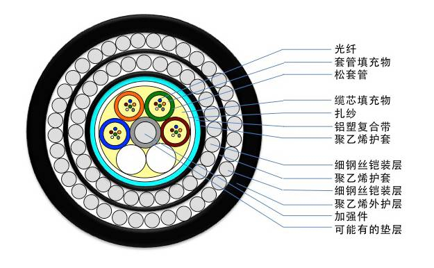 "非金属加强件、松套层绞、聚乙烯内护套芳纶铠装、聚乙烯外护套"